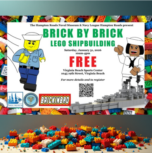 Welcome to the 15th Annual Brick by Brick: Lego Shipbuilding! Join the Hampton Roads Naval Museum, in partnership with Navy League Hampton Roads and Brickinbad Virginia Beach, for a fun-filled day of creativity and imagination at the Virginia Beach Sports Center. Let your inner builder shine as you construct a Lego ship for the competition–or just build for fun! This in-person event is perfect for all ages with activities for everyone, including: participating in our shipbuilding contest, creating Lego crafts, building U.S. Navy ships designed by our staff, viewing professional-level Lego displays, participating in Lego robotics, and much more! Don’t miss out on this unique opportunity to showcase your building skills and connect with other Lego lovers. See you there!