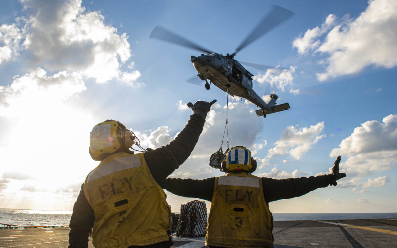 MEDITERRANEAN SEA (Jan. 18, 2022) Aviation Boatswain’s Mate (Handling) 2nd Class Jake Nowell, left, from Chesapeake, Virginia, and Aviation Boatswain’s Mate (Handling) 3rd Class Aubrey Bogle, from Balch Springs, Texas, direct the pilot of an MH-60S Sea Hawk helicopter, attached to the “Dragonslayers” of Helicopter Sea Combat Squadron (HSC) 11, on the flight deck of the Nimitz-class aircraft carrier USS Harry S. Truman (CVN 75) during a replenishment-at-sea with the fast combat support ship USNS Supply (T-AOE 6), Jan. 18, 2022. The Harry S. Truman Carrier Strike Group is on a scheduled deployment in the U.S. Sixth Fleet area of operations in support of naval operations to maintain maritime stability and security, and defend U.S., allied and partner interests in Europe and Africa. (U.S. Navy photo by Mass Communication Specialist 3rd Class Christopher Suarez)