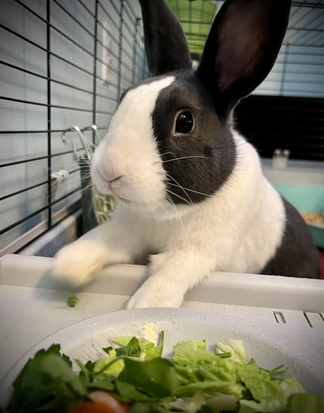 Meet Cadbury! Our 1yo Dutch rabbit. He loves exploring around the house, stealing a warm spot in his big sister’s dog bed, and snuggles with his humans. His favorite treat is his daily leafy green salad. He is very smart and was easily litter box trained. He loves his family, and we love him!