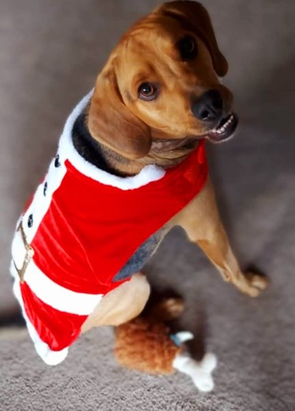 | Izzy showing off his Santa outfit But refuses to his Santa hat |